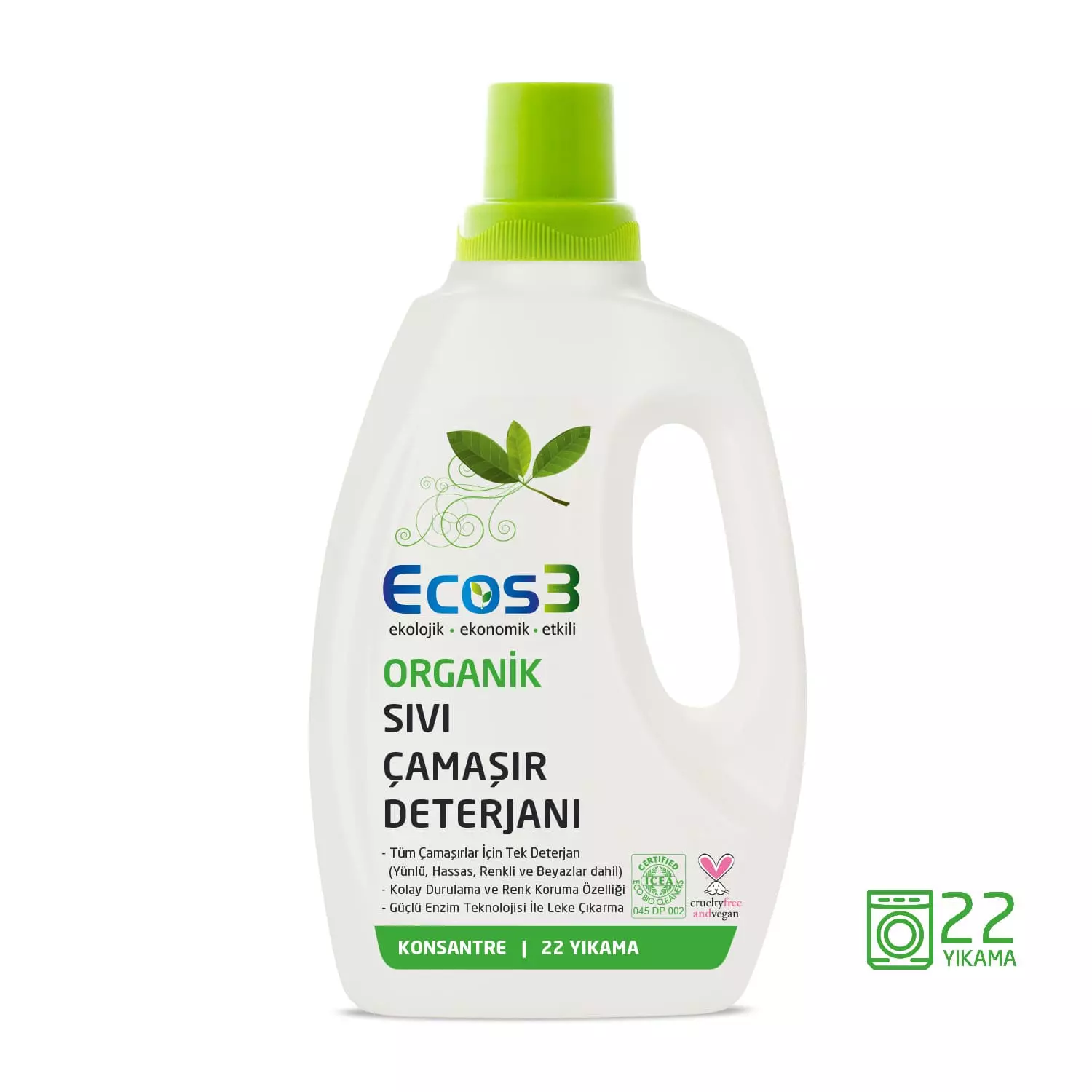 Ecos3 Organik Çamaşır Deterjanı: Zararlı kimyasal içermeyen, doğal, Vegan ve bitkisel içeriğe sahiptir. Avrupa’nın en güvenilir sertifikasyon kuruluşlarından biri olan ICEA (Ethical and Environmental Certification Institute – ITALY ) tarafından Organik olarak sertifikalandırılmıştır. Ecos3 Organik Çamaşır Deterjanı, PeTA tarafından Vegan & Curelty-free sertifikalandırılmış doğal bir üründür. Ürünün kendisi ve ayrıca içeriğinde kullanılan hiçbir hammadde hayvanlar üzerinde test edilmemiştir.