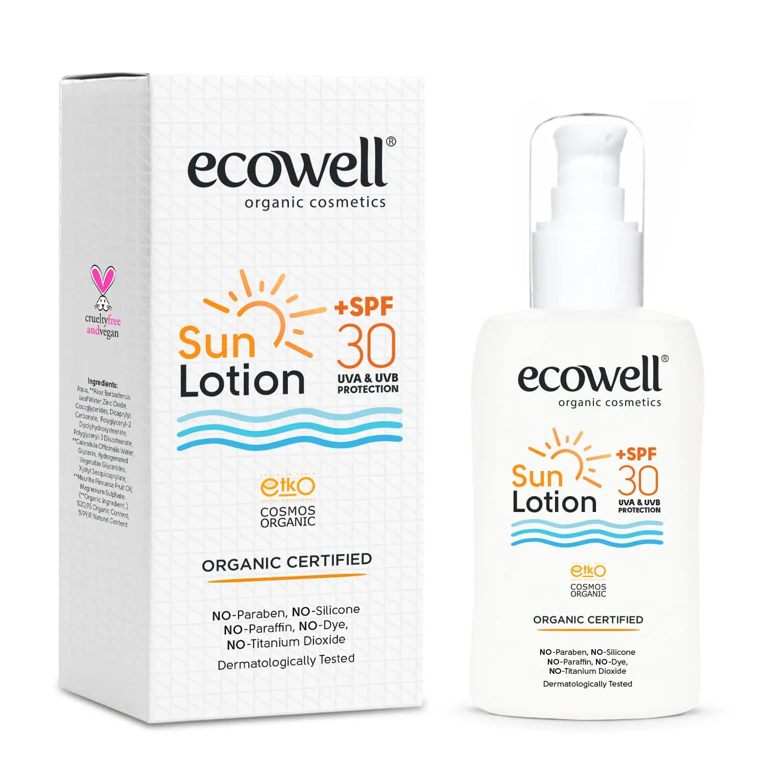 Ecowell Organik Güneş Losyonu, hassas yüz bölgesi dahil tüm vücuda uygun olarak doğal içeriklerle formüle edilmiştir. Organik sertifikalı, doğal ve bitkisel içeriği ile güneşin zararlı UVA ve UVB etkilerine karşı 30 faktör koruyucu etki sağlar.